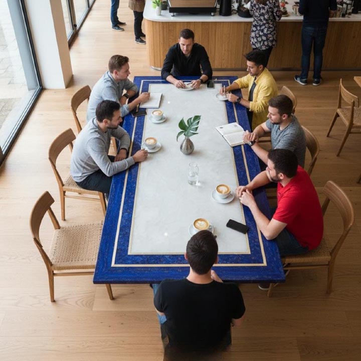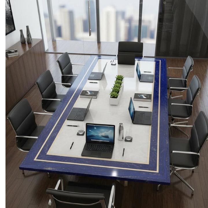 White Quartz Stone Table with Lapis Lazuli Border – Handcrafted Luxury Gemstone Furniture