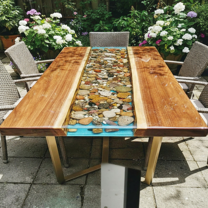 It is a modern coffee table made with transparent epoxy resin that encases decorative pebbles inside the surface, creating a unique artistic design.