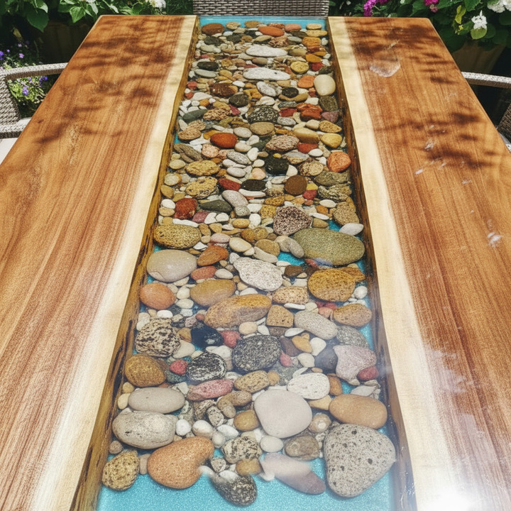 Clear Epoxy Resin Coffee Table with Pebbles – Minimalist, Handcrafted & Polished
