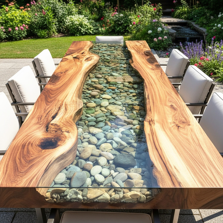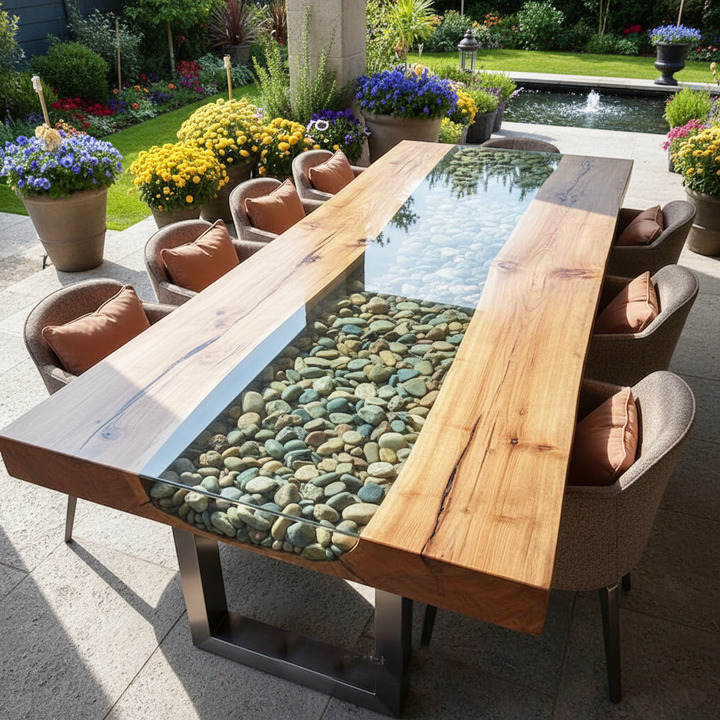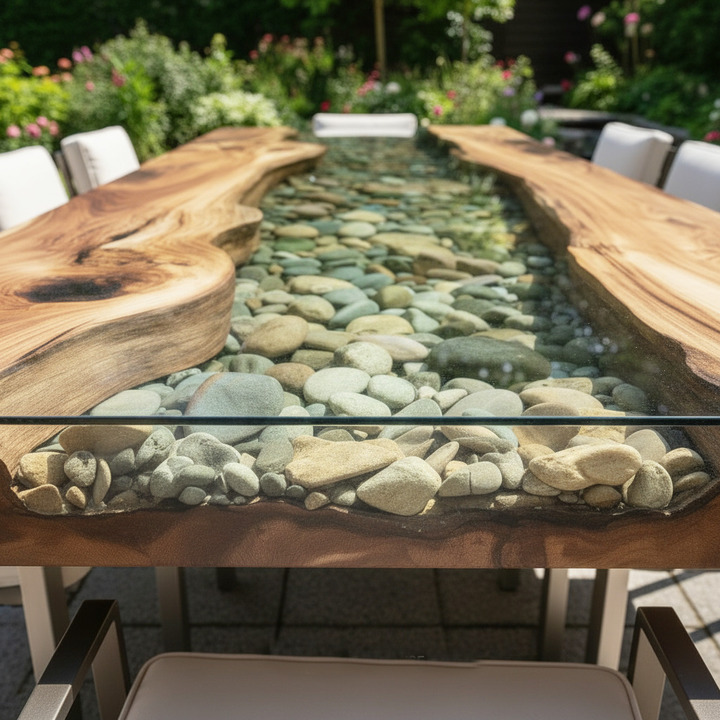 A clear epoxy coffee table with natural pebbles is a handcrafted furniture piece where decorative pebbles are sealed inside transparent epoxy resin to create a unique artistic surface.
