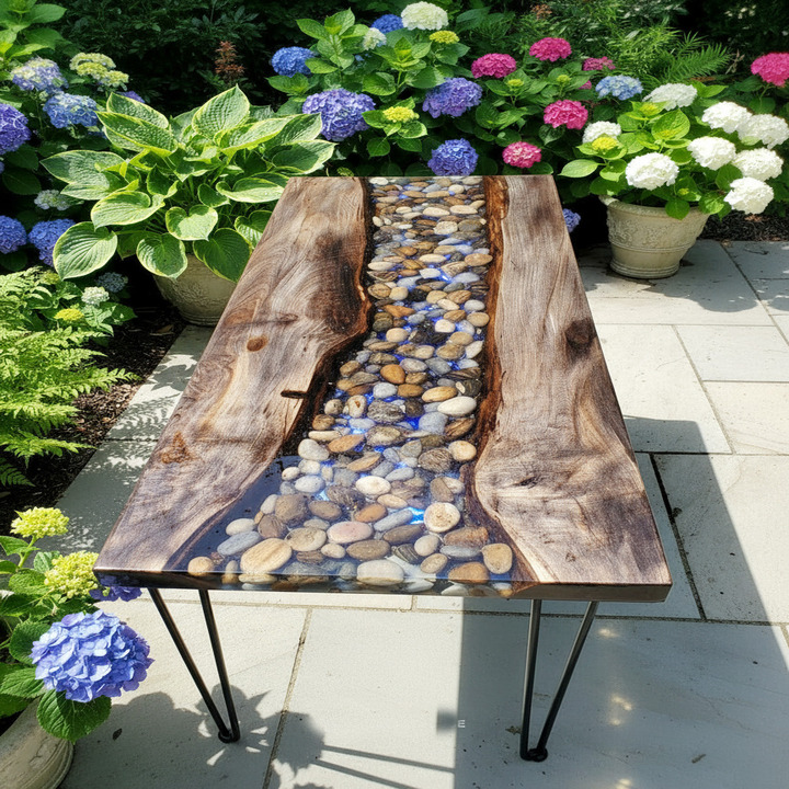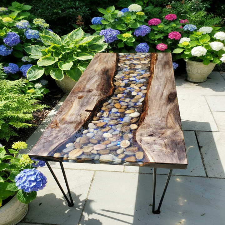 A clear epoxy resin coffee table is a modern furniture piece made with transparent resin that creates a crystal-clear surface while showcasing decorative elements like pebbles or wood.