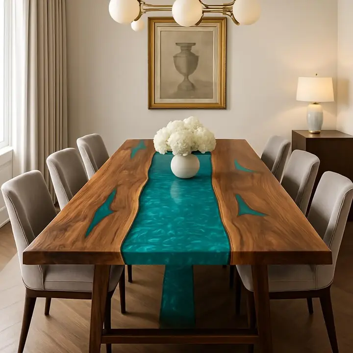 Built for durability and everyday use, this solid wood epoxy dining table features a strong hardwood structure, precision resin casting, and a professionally polished surface for long-lasting beauty. Ideal for luxury dining rooms, modern homes, upscale restaurants, and designer interiors.