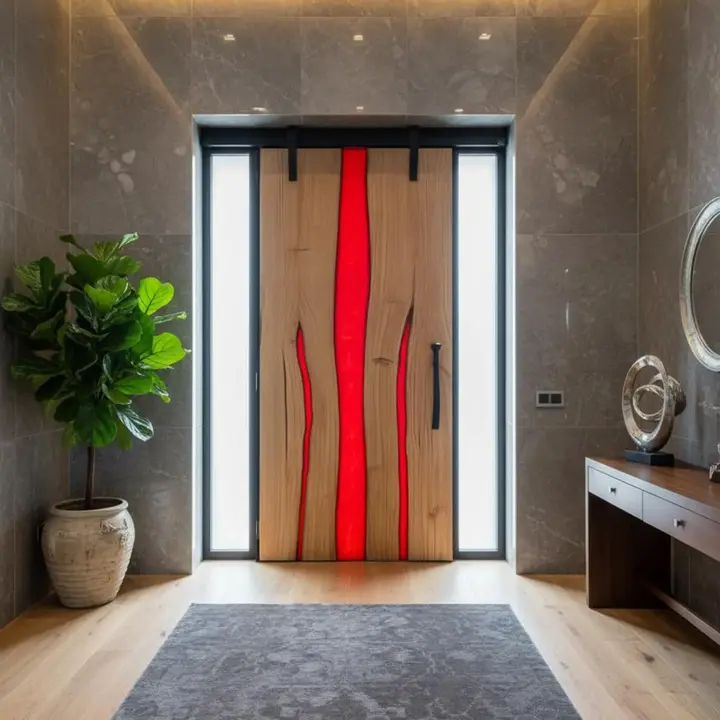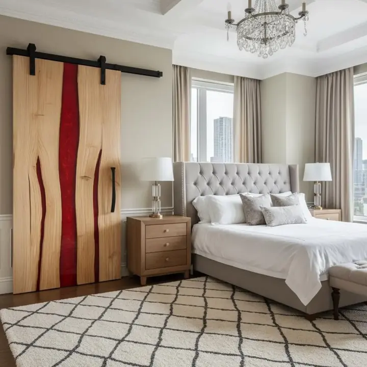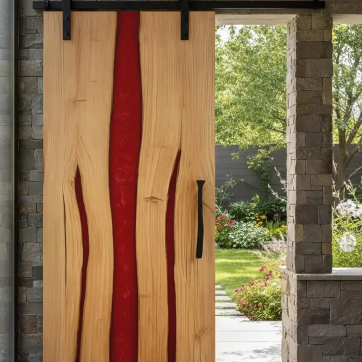 Custom Red Epoxy Resin Barn Door | Handmade Wood Sliding Door with Artistic Modern Design
