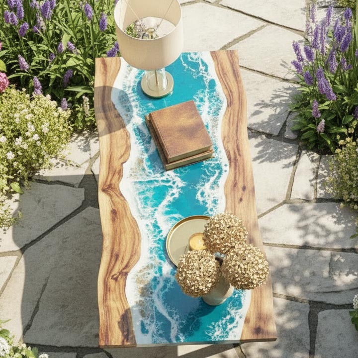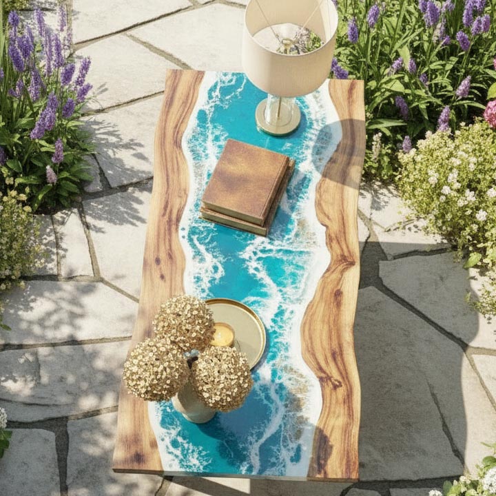 The rich solid wood slab is carefully selected for its natural grain, knots, and character, then combined with crystal-clear blue epoxy resin to create a flowing water effect that resembles a serene coastal shoreline. The glossy, glass-like finish enhances depth, durability, and long-lasting beauty.