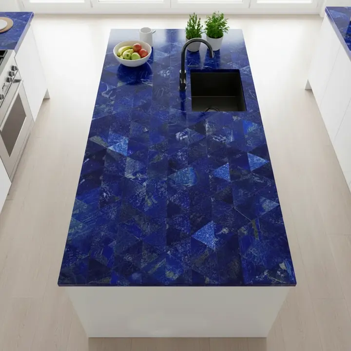 Luxury lapis gemstone countertop slab crafted from natural semi-precious stone, ideal for kitchen countertops and bathroom vanities. Each piece features unique patterns and rich colors.