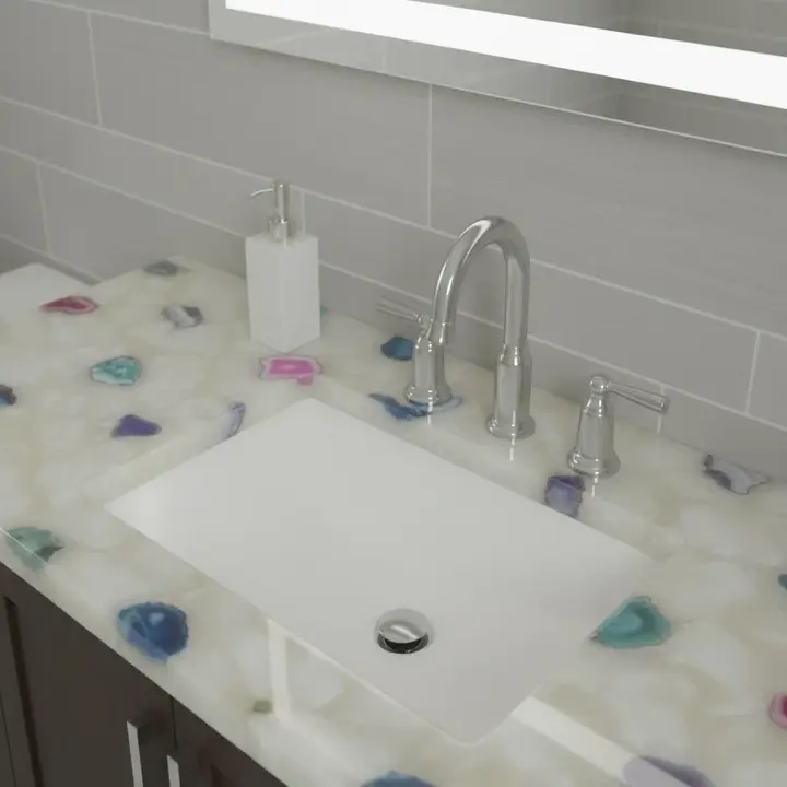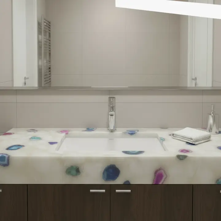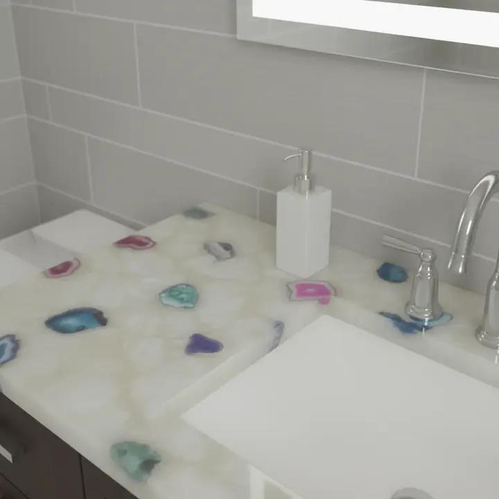 Elevate your interiors with this luxury gemstone countertop slab, crafted from natural semi-precious agate stones and meticulously handcrafted to create a stunning, one-of-a-kind surface. Each slab showcases unique colors, organic patterns, and natural translucency that bring elegance and character to both kitchen and bathroom spaces.