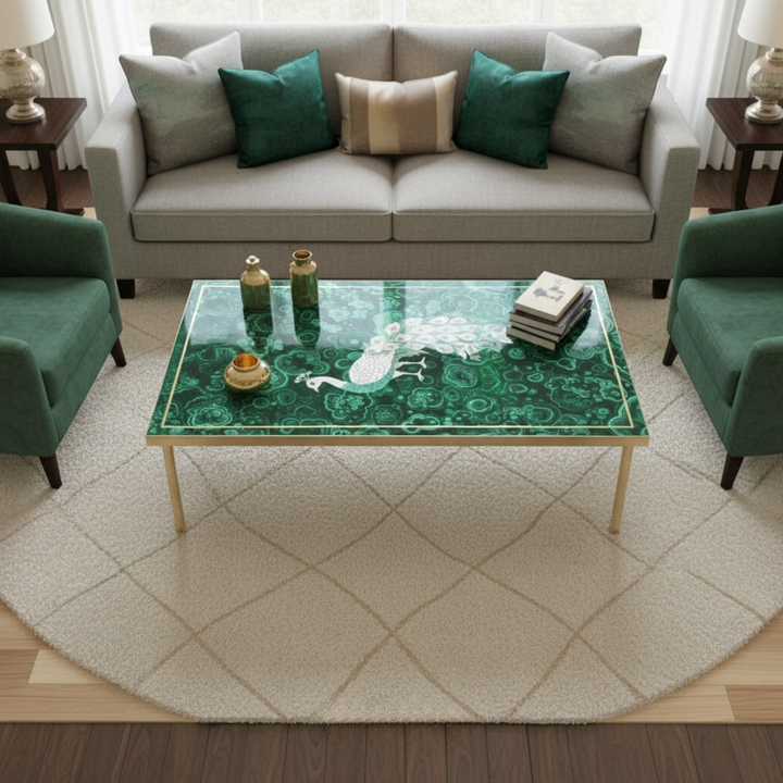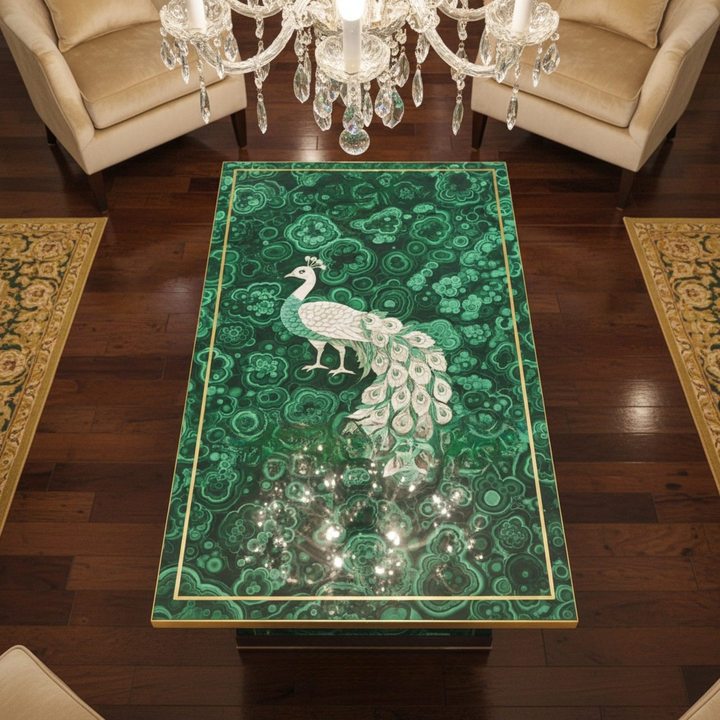 A malachite coffee table is a luxury furniture piece made from natural green malachite stone with unique patterns and premium visual appeal.
