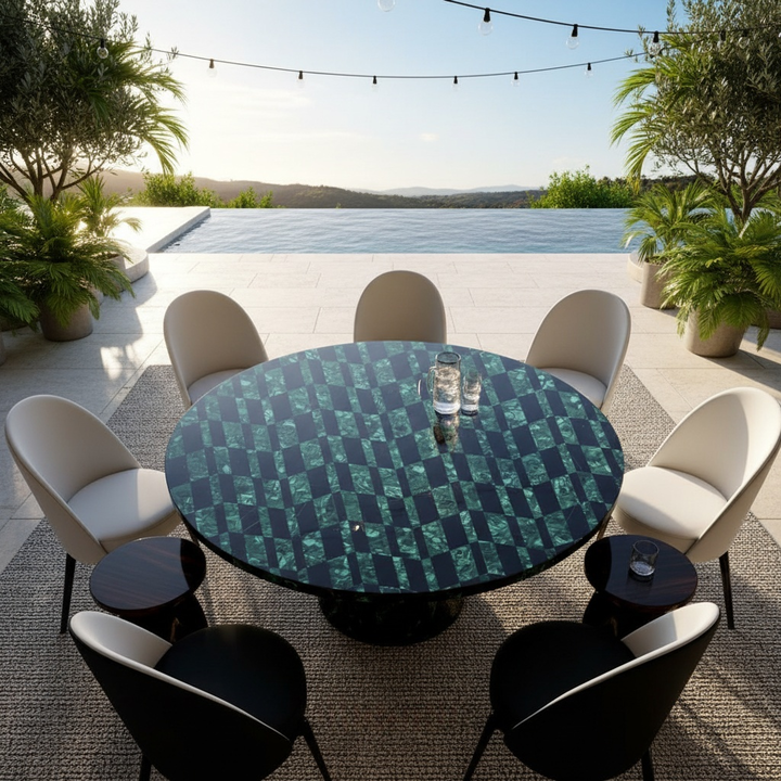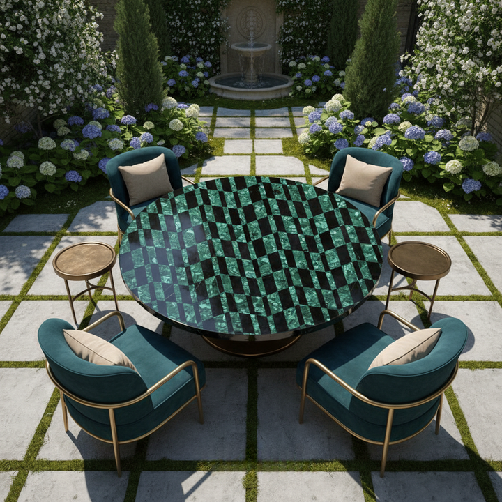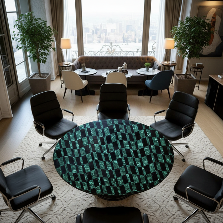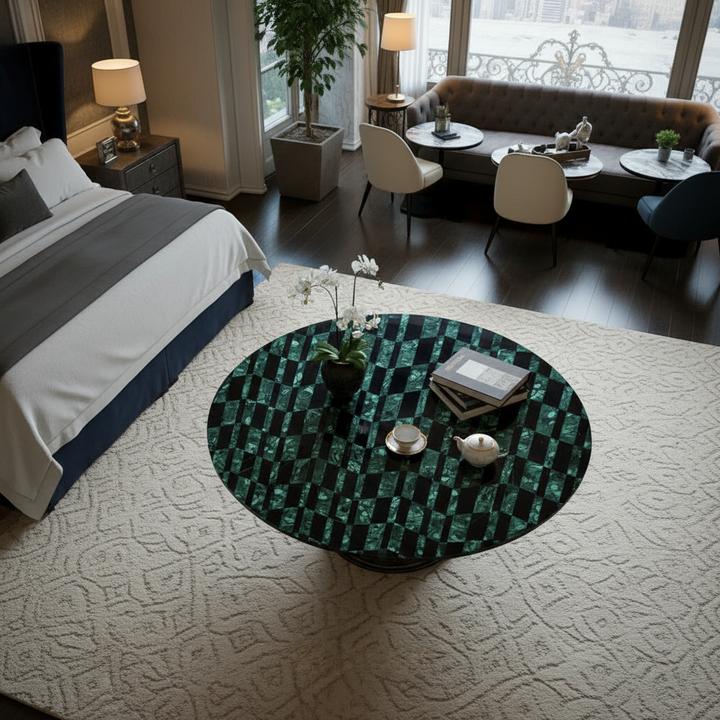 A black marble malachite center table is a handcrafted furniture piece featuring real malachite stone inlay embedded into polished black marble for a luxury look.