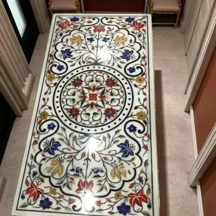 Each table is individually handmade by skilled artisans, ensuring precision, uniqueness, and long-lasting durability. Its intricate floral inlay design complements both modern and traditional interiors, making it ideal for family dining rooms, boutique homes, or luxury interiors.