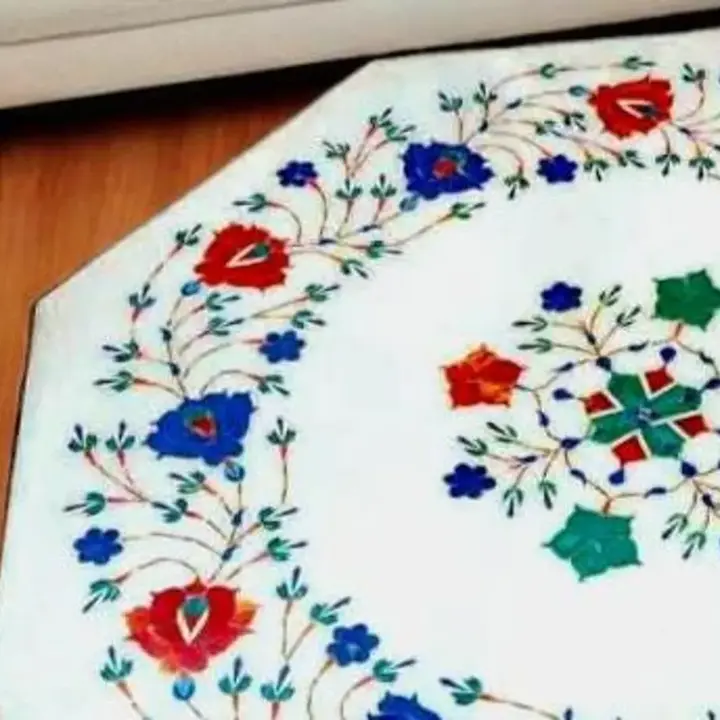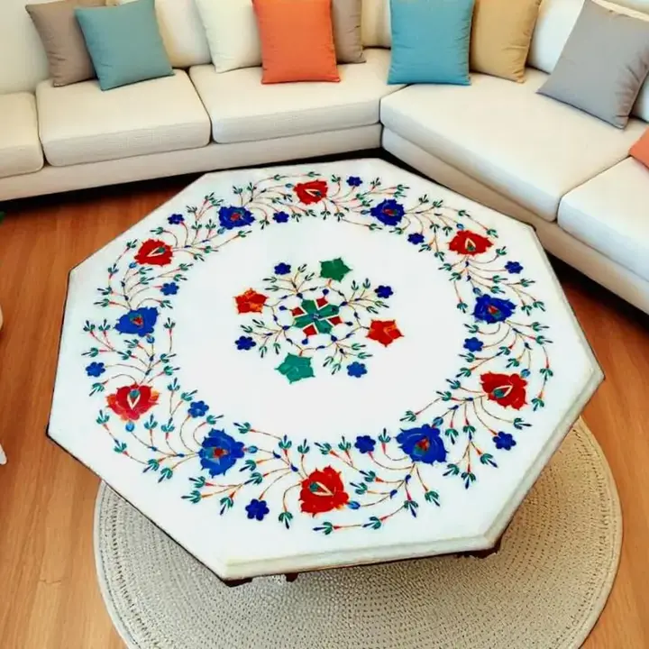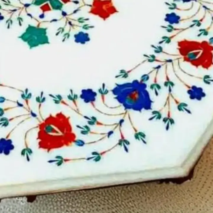 A white marble lapis side table is a handcrafted furniture piece featuring genuine lapis stone inlay embedded into marble to create decorative floral artwork.