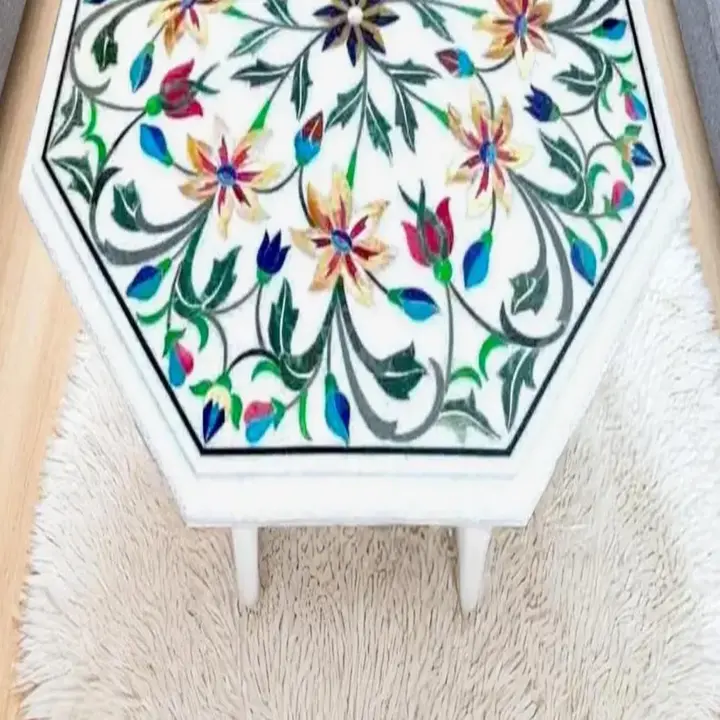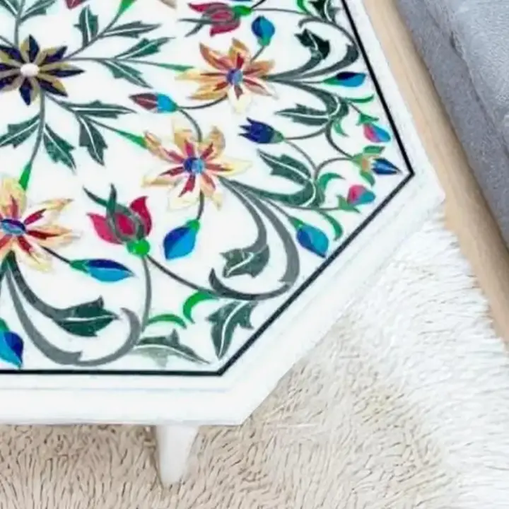 A white marble floral inlay side table is a handcrafted furniture piece featuring semi-precious stone designs embedded into marble for decorative elegance.