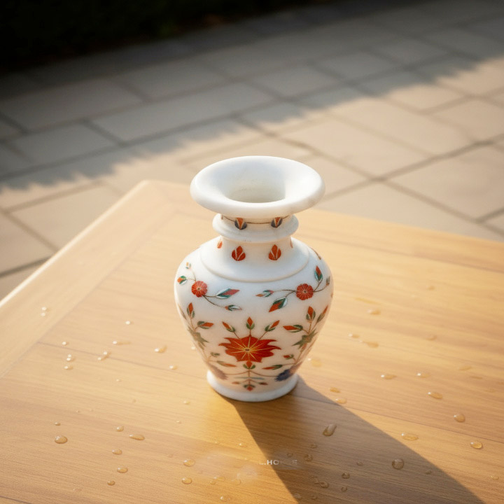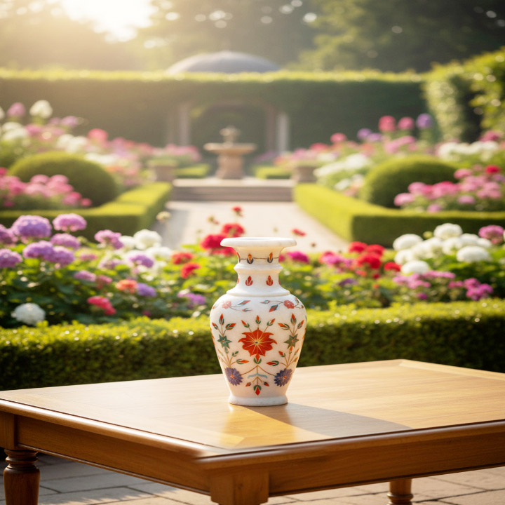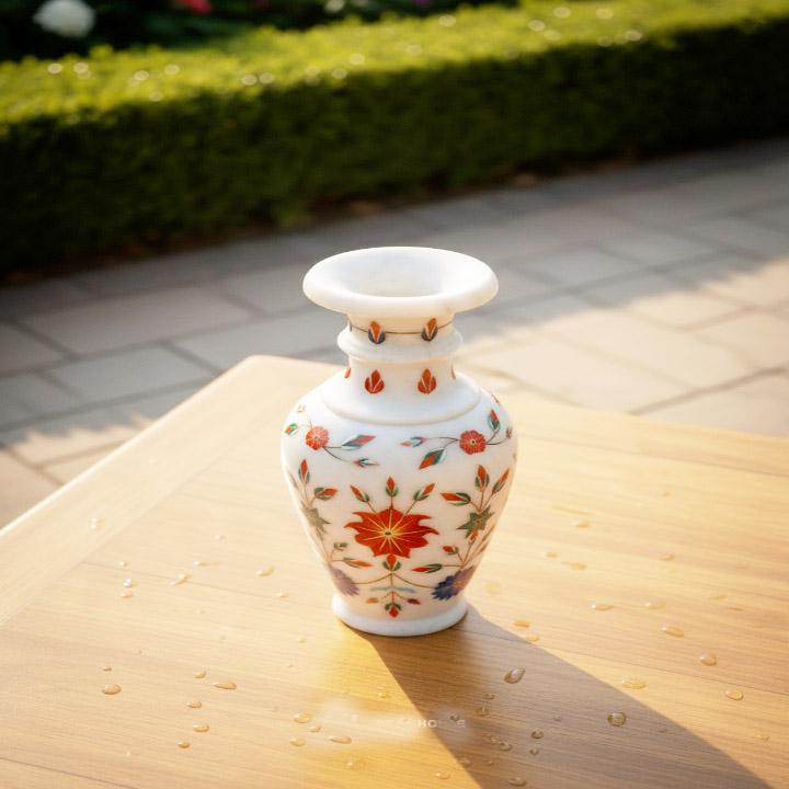 Made from premium quality white marble and adorned with colorful semi-precious stones, each vase is unique and meticulously detailed, making it an exquisite centerpiece for any living room, office, or entryway. Its luxurious design enhances your home décor while celebrating the artistry of EMKAY Handicraft Exports.