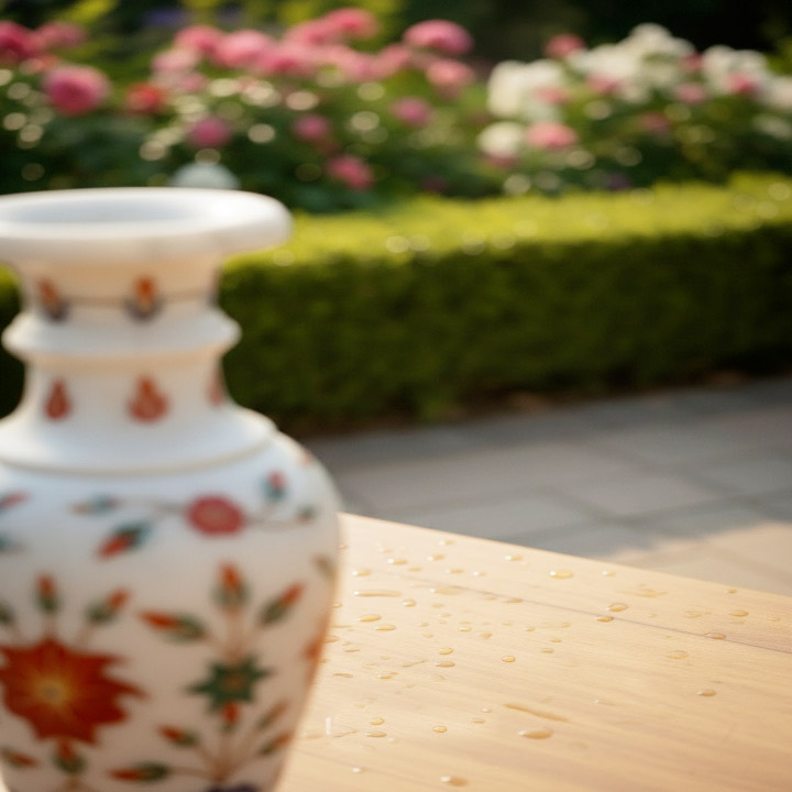 Gently dust with a soft cloth and avoid harsh cleaners or excess moisture to protect the marble and inlay work.