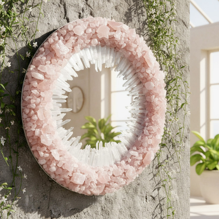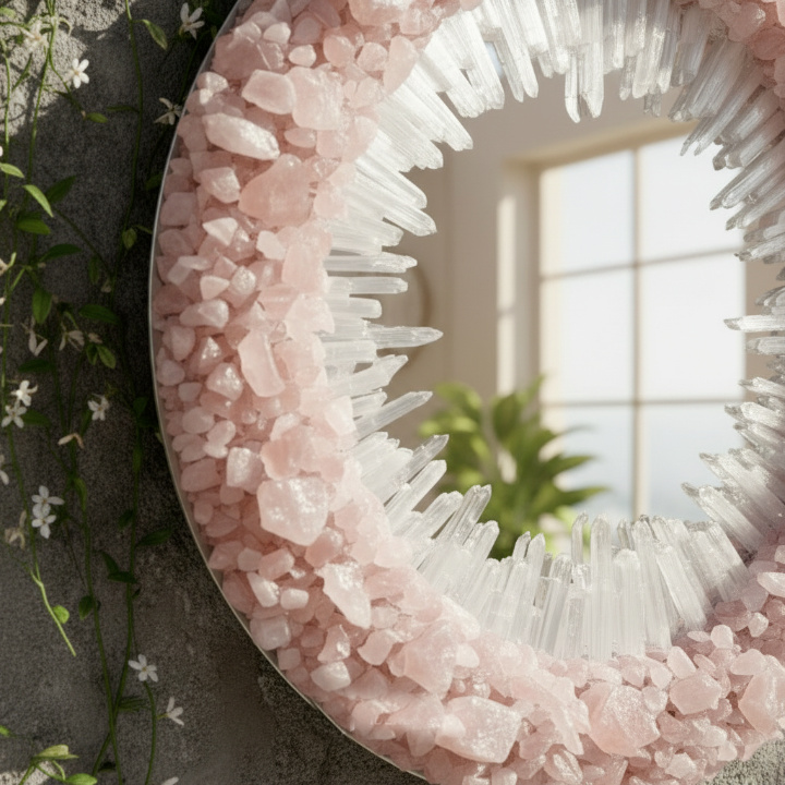 Handmade Rose Quartz & Selenite Wall Mirror – Luxury Natural Stone Home Decor