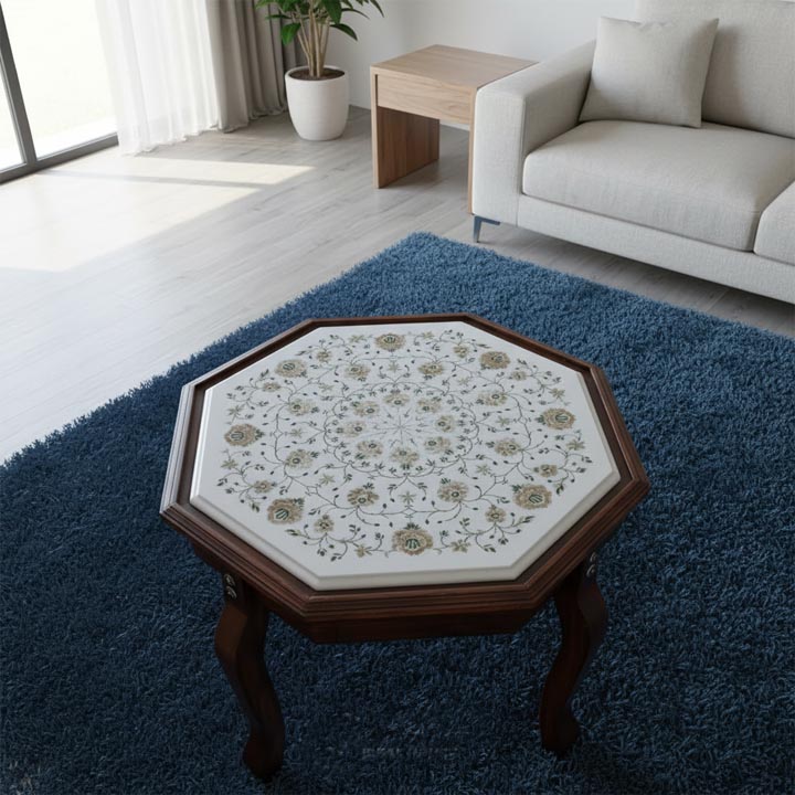 Unique White Marble Coffee Table with Detailed Floral Inlay – 18×18 Inches | Handmade Luxury by Emkay Handicraft Exports