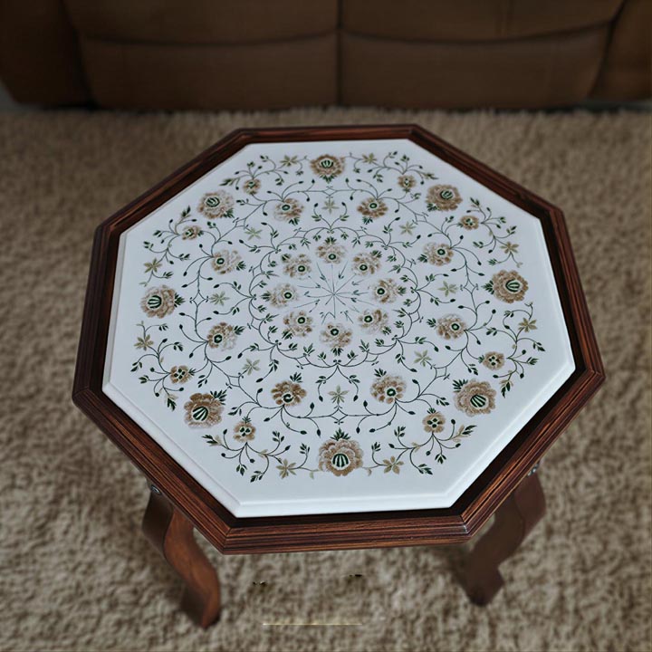 This table features a detailed floral stone inlay handcrafted into natural white marble, making it a distinctive home décor accent.