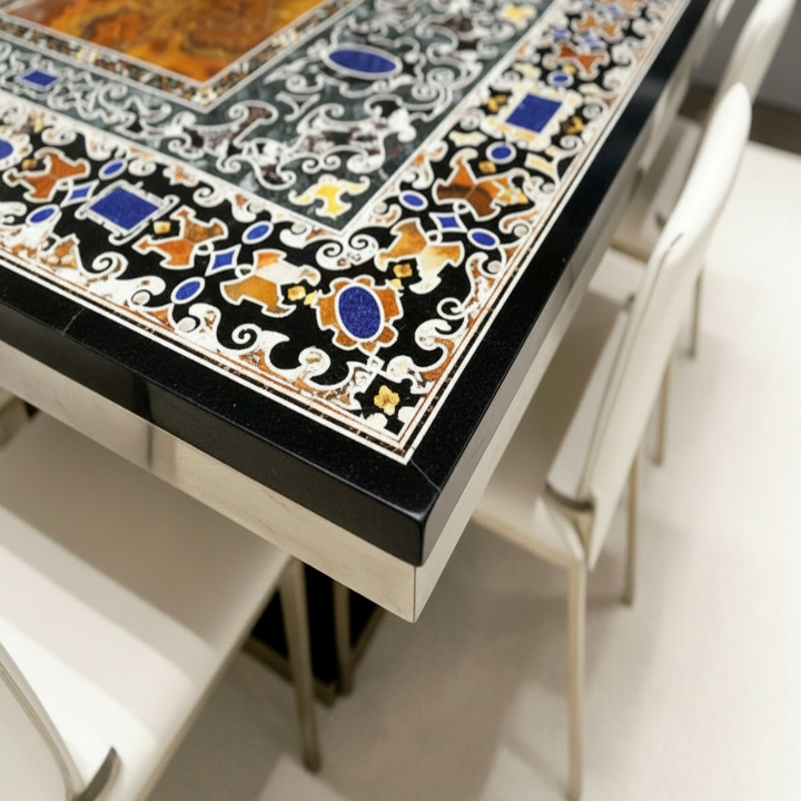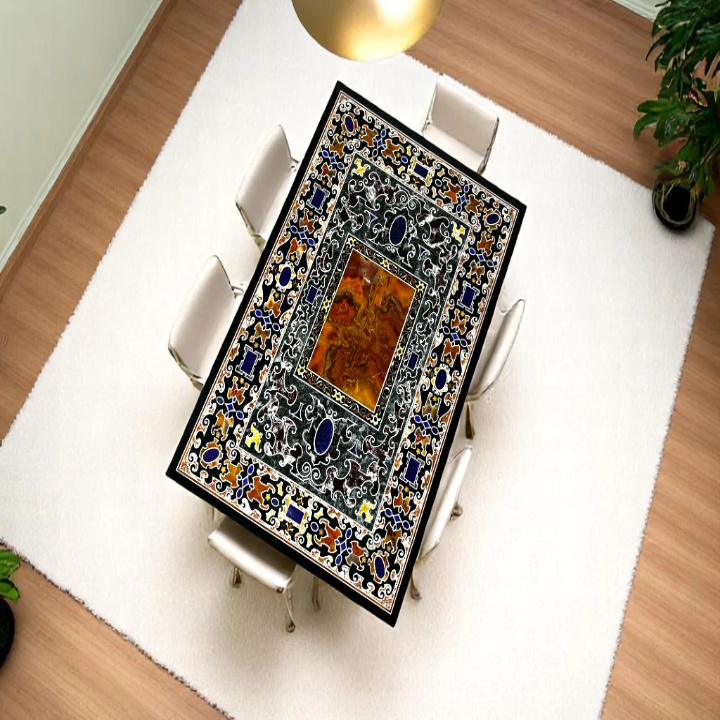 Handcrafted black marble dining table with intricate inlay design