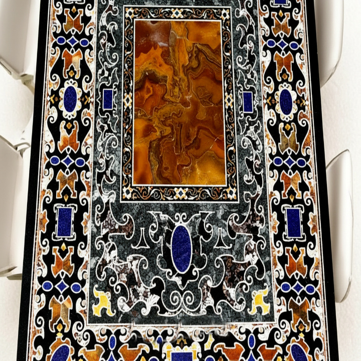 A black marble inlay table is a luxury furniture piece handcrafted using the Pietra Dura technique, where semi-precious stones are intricately inlaid into solid black marble.