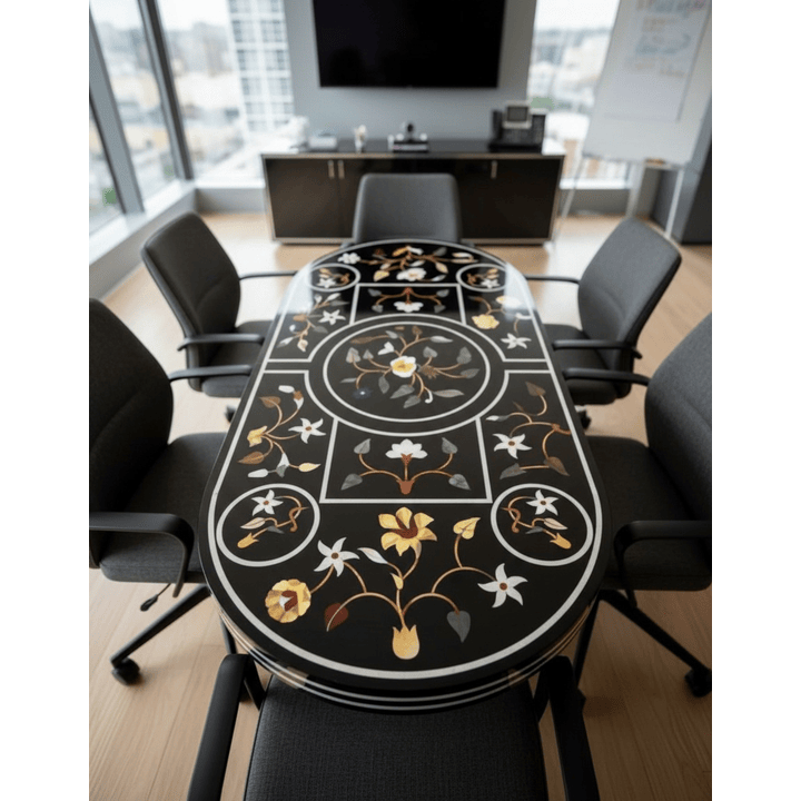 A luxury black marble dining table is a handcrafted table made from natural black marble, designed with intricate Pietra Dura floral inlay using semi-precious stones.