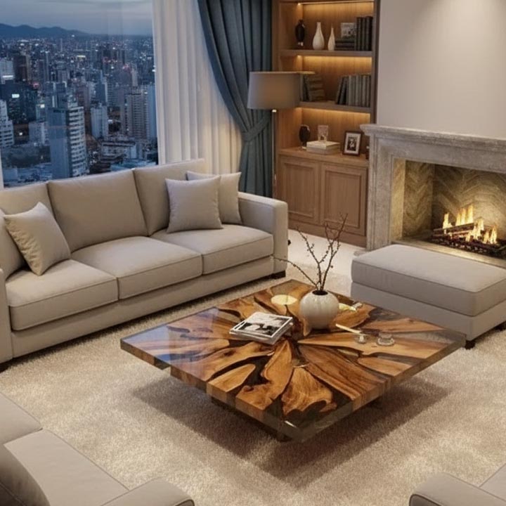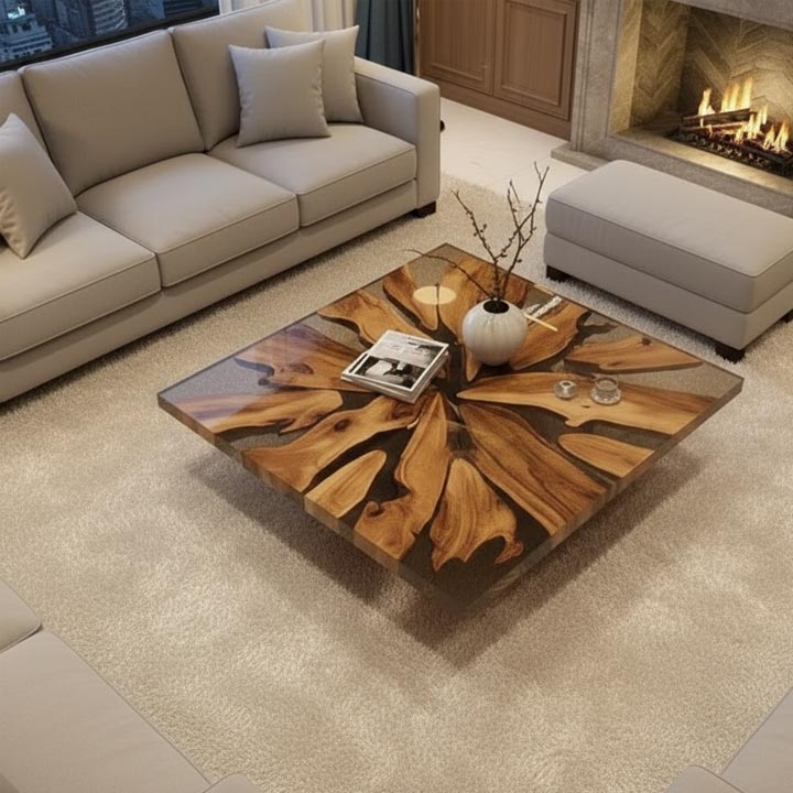 Crafted using premium-quality wood and high-gloss epoxy resin, this table combines modern design with natural charm. The square shape offers a balanced, contemporary look, making it perfect as a coffee table or center table for living rooms, lounges, or luxury interiors.